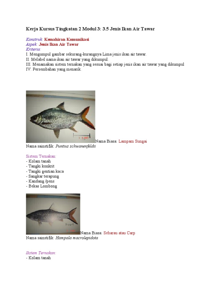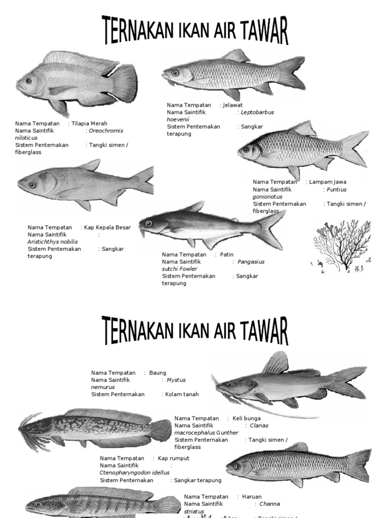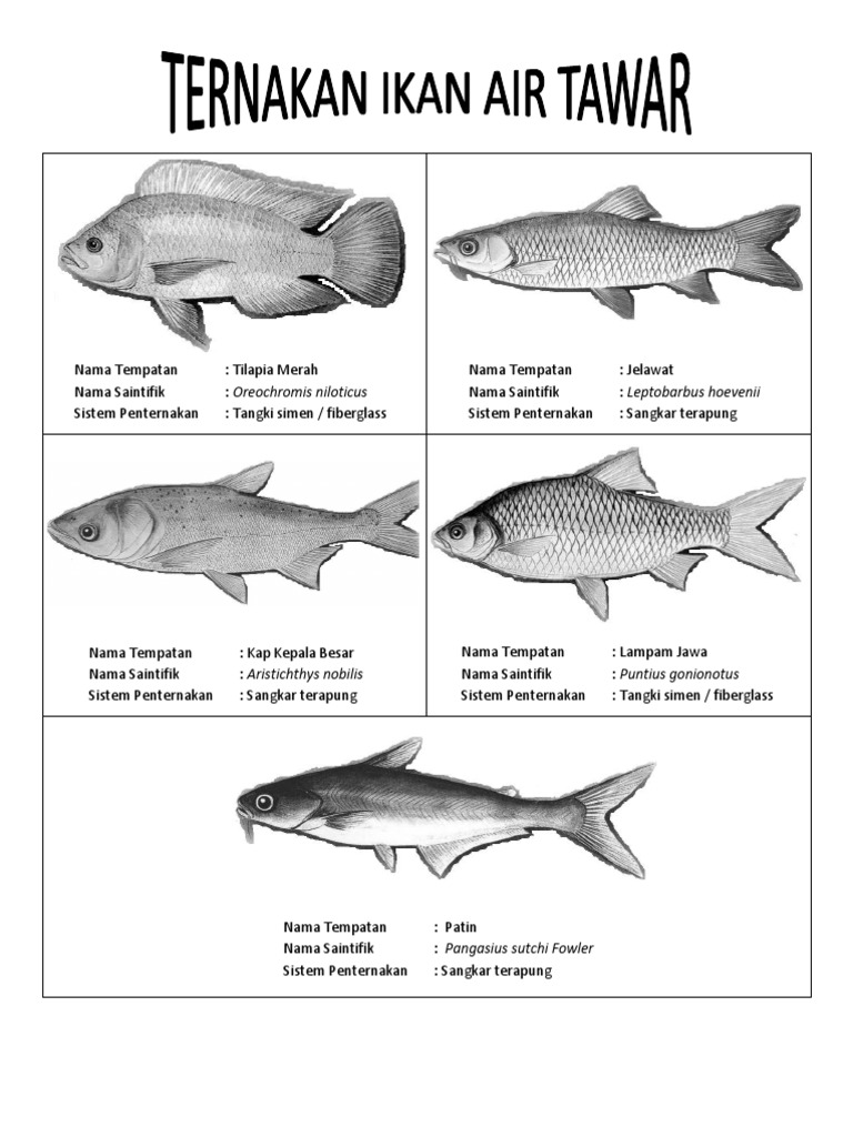 Lengkapkan jenis-jenis ikan air tawar di bawah. Kini segala kerja menguruskan kebun 7 tembikai diserahkan kepada Pak Kiassim lantaran Laiman sibuk dengan projek baharunya itu. Ternakan ikan air tawar boleh ditakrifkan sebagai usaha menternak haiwan akuatik dengan persekitaran yang terkawal dan pengawasan serta penjagaan yang rapi untuk mendapatkan keuntungan ekonomi yang maksima.
